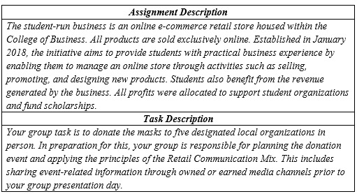 Students in the retailing class first learned about the student-run business (see Table 4) and five community organizations, each with its primary functions. As part of the assignment, they then applied the retail communication mix by promoting the event through owned or earned media channels, both before and after the event. The objective was to encourage students to initiate relationship-building efforts with the community.