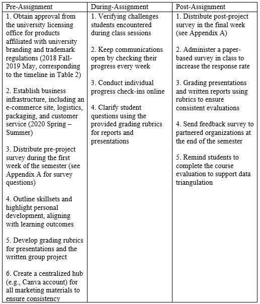 Preparing for the group project, which was based on a real business, required substantial planning. Table 6 outlines the preparation process for pre-, during-, and post-assignment phases, corresponding with the timeline presented in Table 2. For example, obtaining approval from the university’s licensing office and establishing the business infrastructure were necessary steps prior to implementing the assignment. While institutional procedures may vary, the pre-, during-, and post-assignment checklists can serve as a helpful guide for instructors considering the integration of a student-run business into their curriculum. Importantly, the duration of the university’s approval process should be considered when planning such curricular initiatives.