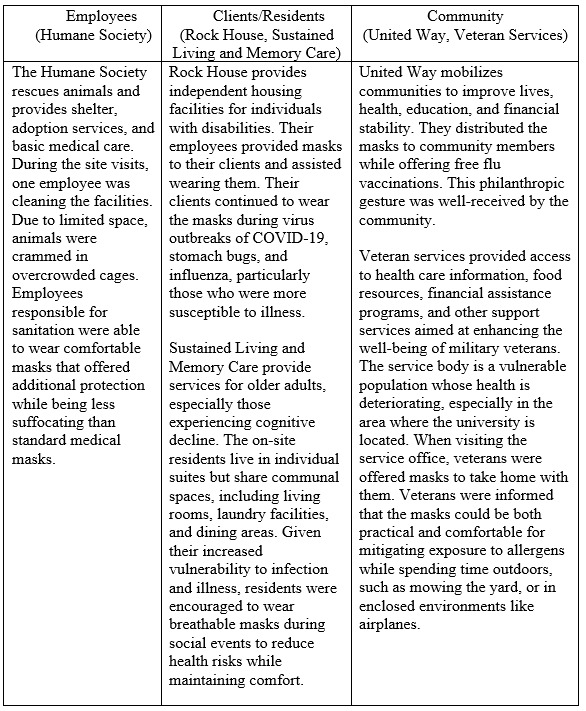 During the summer online retailing class, the instructor adopted this suggestion and tasked students with researching local organizations. Their group project was to identify the events or client groups for which the masks would be used and estimate the number of masks each organization could accept. To ensure transparency, students sent photos of the masks and clarified that they were not medical-grade and were not intended for use in hospital or laboratory settings. After evaluating seven potential organizations, the student team selected five based on the quality of student reports. These five organizations responded promptly and provided clear descriptions of how the masks would be utilized. As a result, the organizations understood the nature of the masks and agreed to use them appropriately, without compromising the health or safety of their clients.