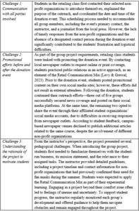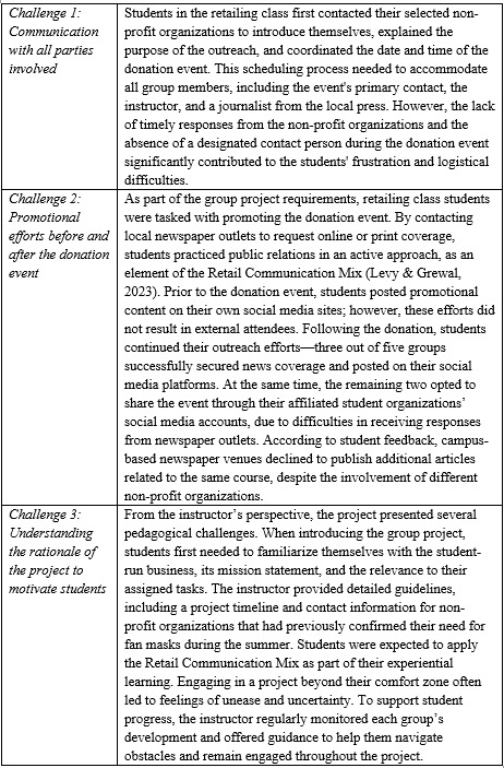 The marketing activities within the retailing class focused on promoting brand awareness of the student-run business, enhancing public relations, and fostering community engagement. The mask donation event led the student team to an opportunity to present the business at a city council meeting, with the broader goal of establishing a long-term partnership with local government and community stakeholders. However, several challenges emerged while preparing for these fan mask donation events, such as logistical coordination and limited resources (see Table 8).