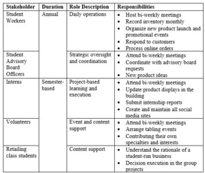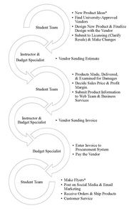 The student team focused on strategies to increase brand awareness and drive sales of their products. Each semester, the team typically consisted of three to ten students from both business and non-business majors. They were recruited through the Student Advisory Board, as well as interns, student organizations, volunteers, and student worker positions (see Table 3 for individual roles and responsibilities). The instructor of the retailing class oversaw the student team, allowing the business to operate autonomously. The instructor ensured vendor payments, with communications typically occurring among the College of Business budget specialist, the instructor, and vendors via email and phone (see Figure 2 for workflow).