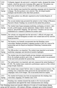 The student team operated independently from the retailing class and comprises interns, volunteers, Student Advisory Board members, and student workers. In contrast, students took the retailing class as an elective within their degree plan. The student team is responsible for securing approvals from the university’s Licensing, Marketing, and Communication Department and regularly presents to the Executive Advisory Board, alum groups, and fundraising audiences—opportunities rarely available outside the classroom. These experiences enhance their presentation and social skills while deepening their understanding of stakeholder engagement. The team also leads idea generation for websites, social media, events, and videos.