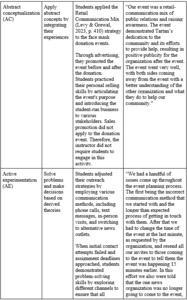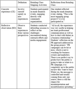 is applicable to this dynamic framework, offering a theoretical foundation for continuous learning and reflection. This study introduced an additional context by incorporating the curriculum into the retailing class and grounding the learning experience in the operation of a real business. By addressing the issue of excess inventory, students were able to apply the Retail Communication Mix within a group project while simultaneously contributing to community well-being. This integration of experiential learning not only reinforced key retailing concepts but also demonstrated the societal value of student-led initiatives.
